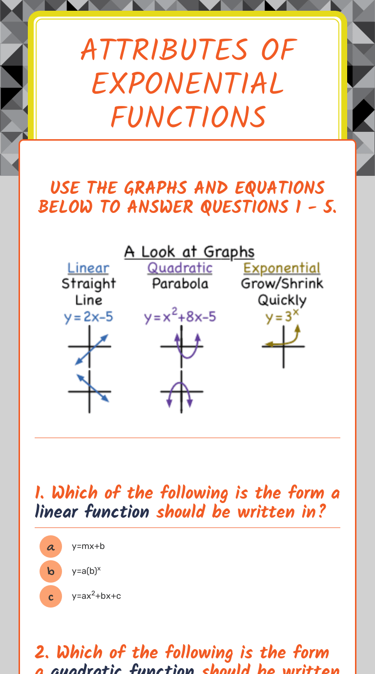 Students create linear and exponential models and then create tables and. Whether to choose a linear function or an exponential function. After students have mastered linear functions and . Which of the following statements are true about an exponential function? The value of each painting after t year is y dollars.